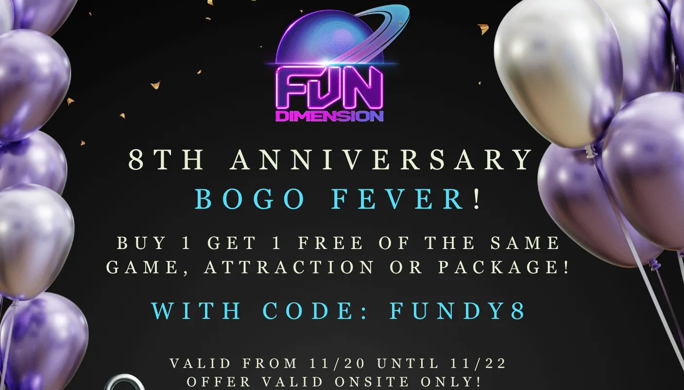 Celebrate our anniversary with double the fun! From November 20th to November 22nd, enjoy an exclusive BOGO special on any game, attraction, or package at FunDimension.