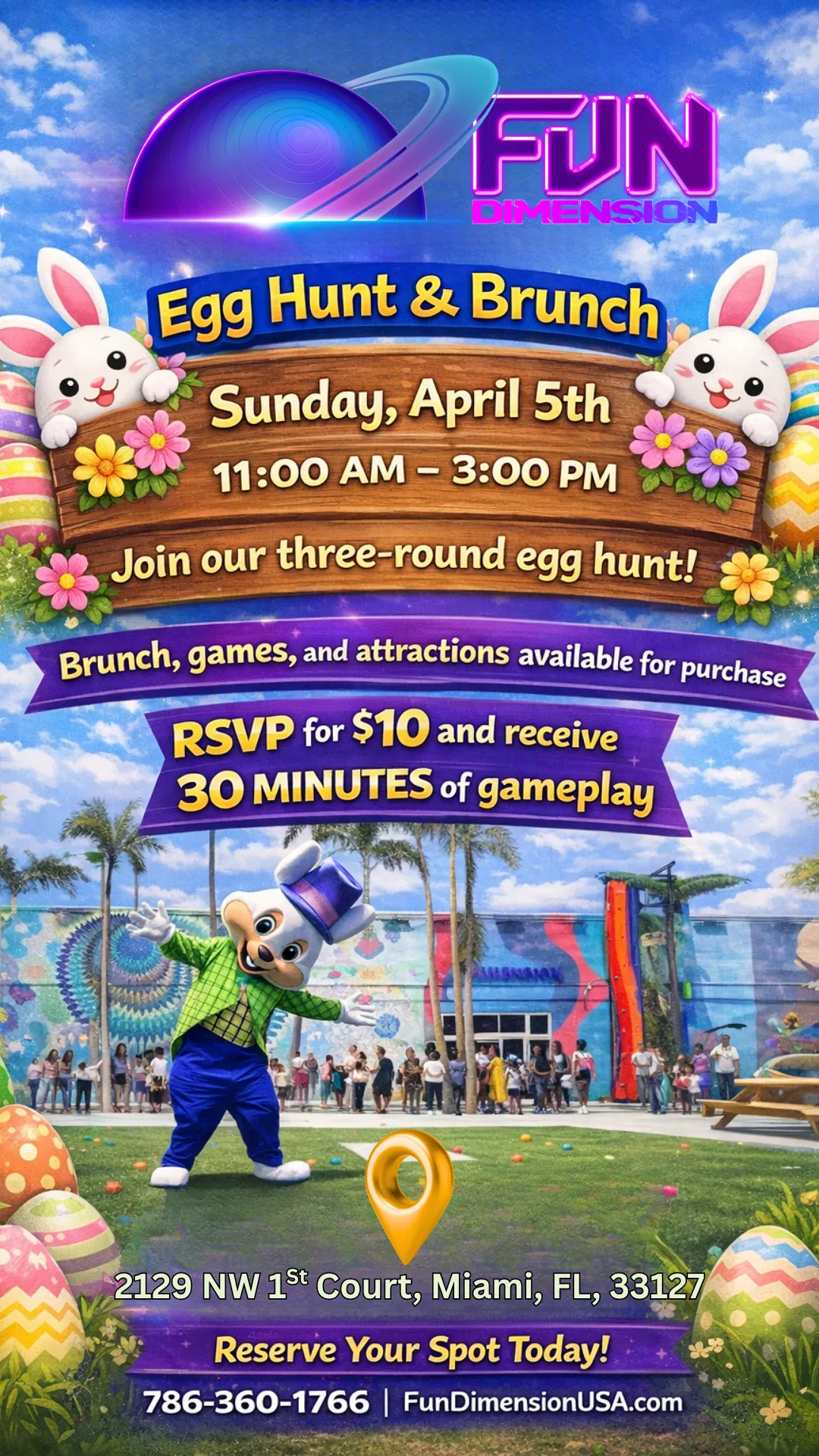 Hop into the Easter spirit at FunDimension on Sunday, April 20th, from 11:00 AM to 3:00 PM, RSVP for only $5! Join us for a delightful day filled with Easter egg hunts, delicious brunch, thrilling games, and fantastic attractions.