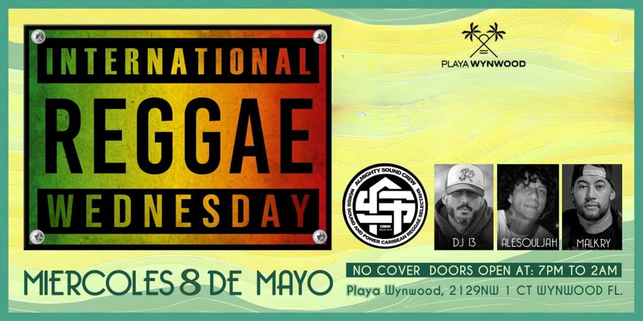 Join us at Playa Wynwood for a sensational evening celebrating the soulful rhythms of reggae music. Immerse yourself in the electrifying beats brought to you by a lineup of talented DJs1!